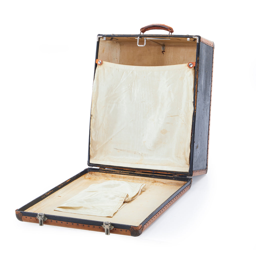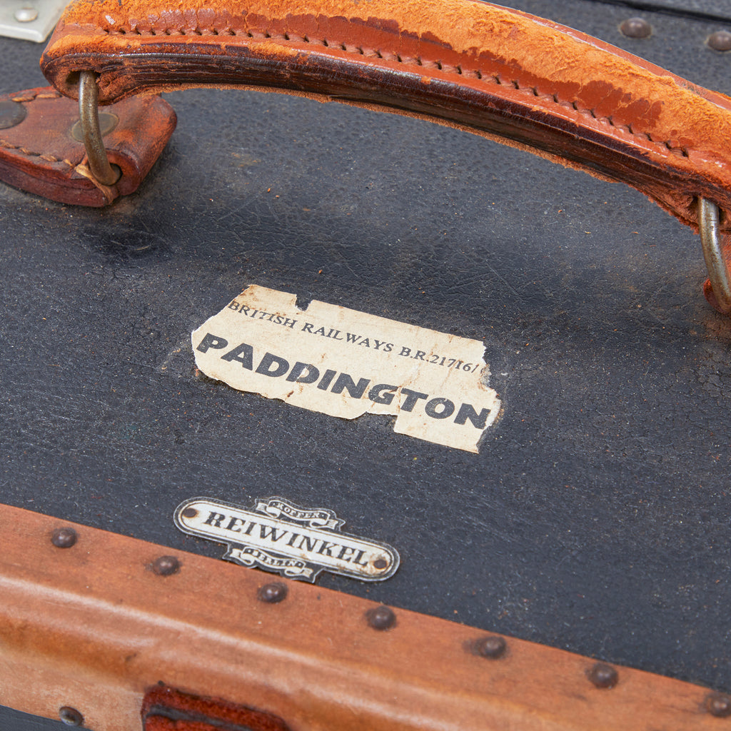 Details: Vintage Reiwinkel navy suitcase with tan leather edges