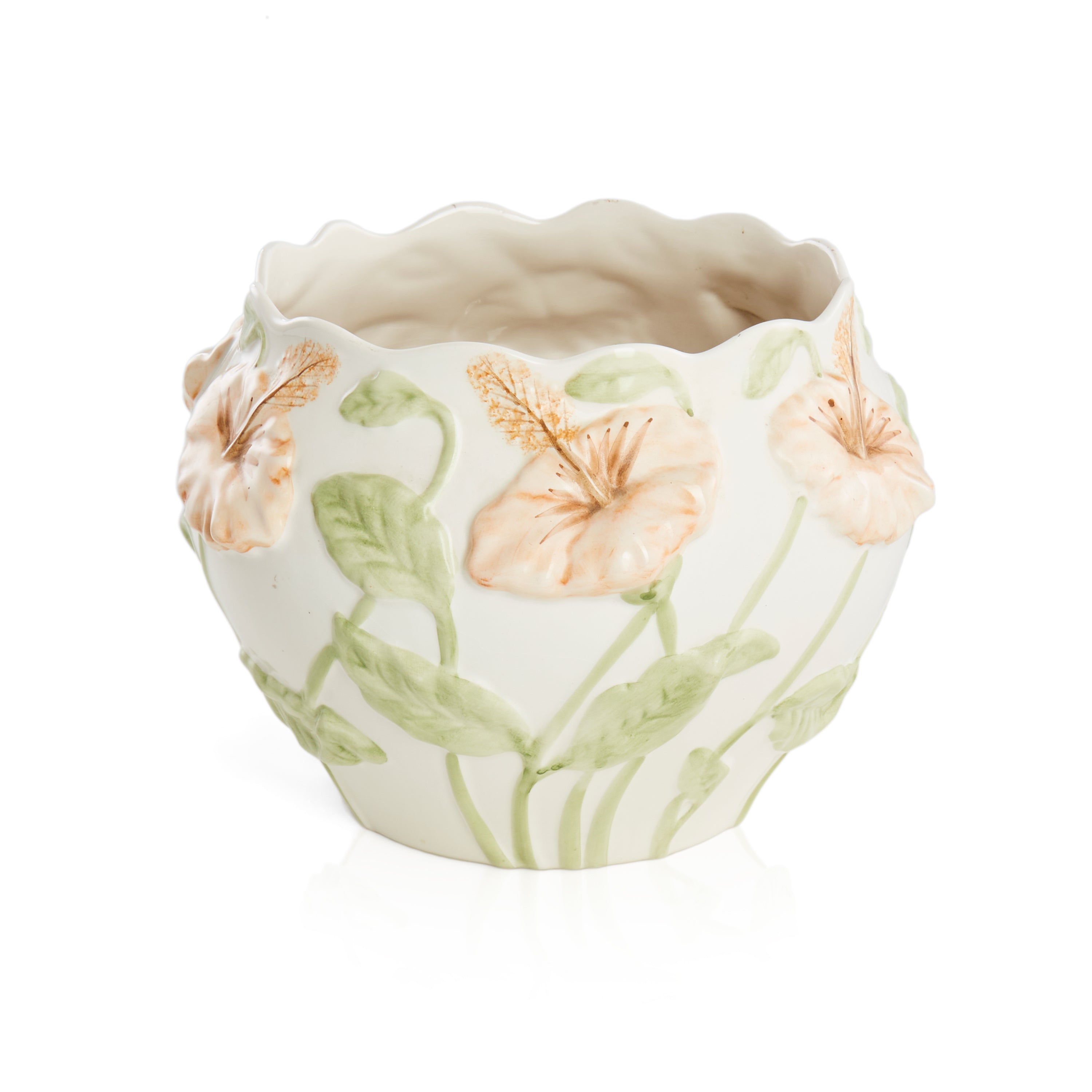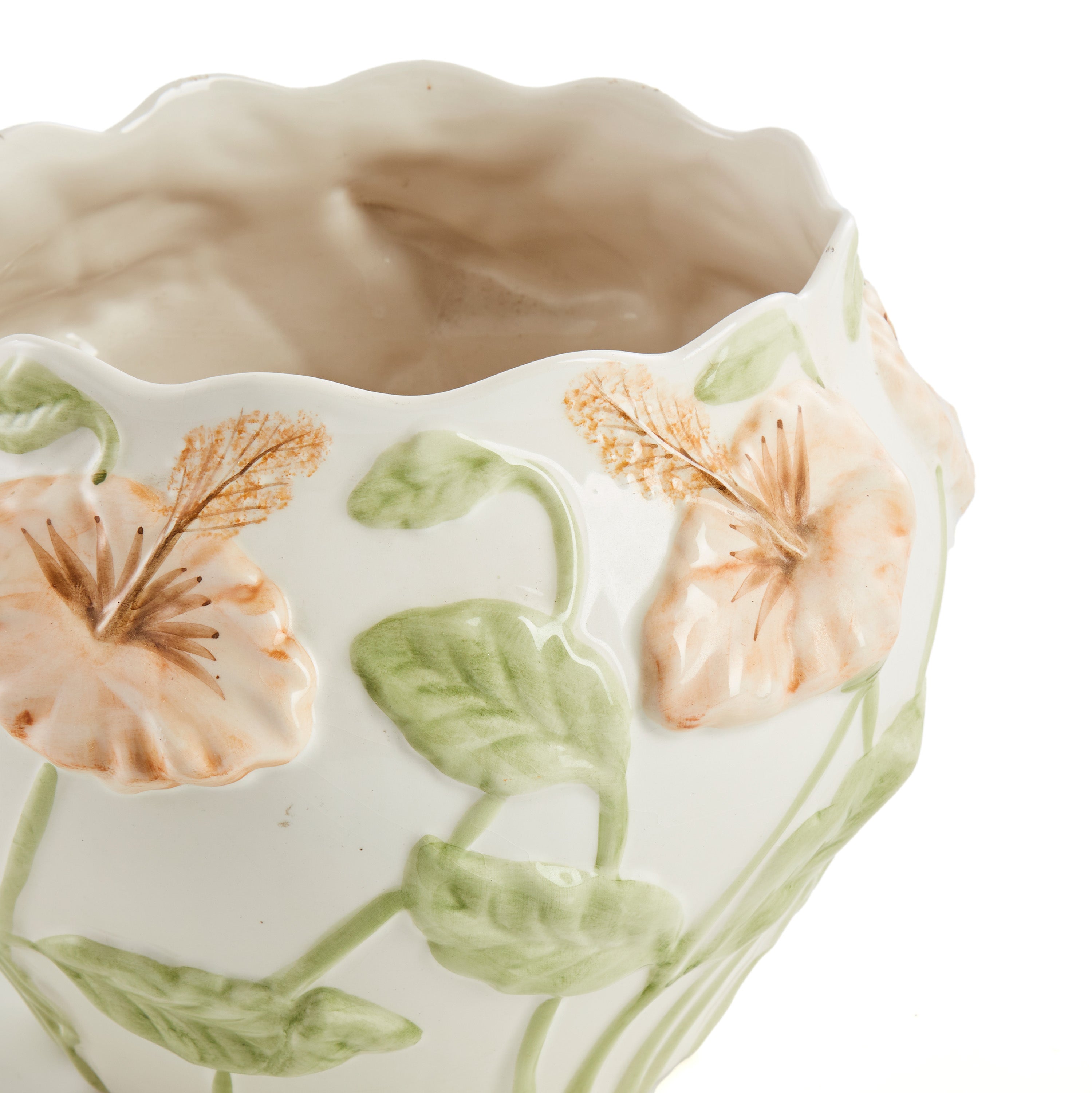Details: White ceramic pot with raised pink and green flowers and scalloped lip