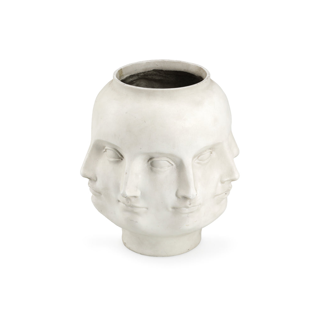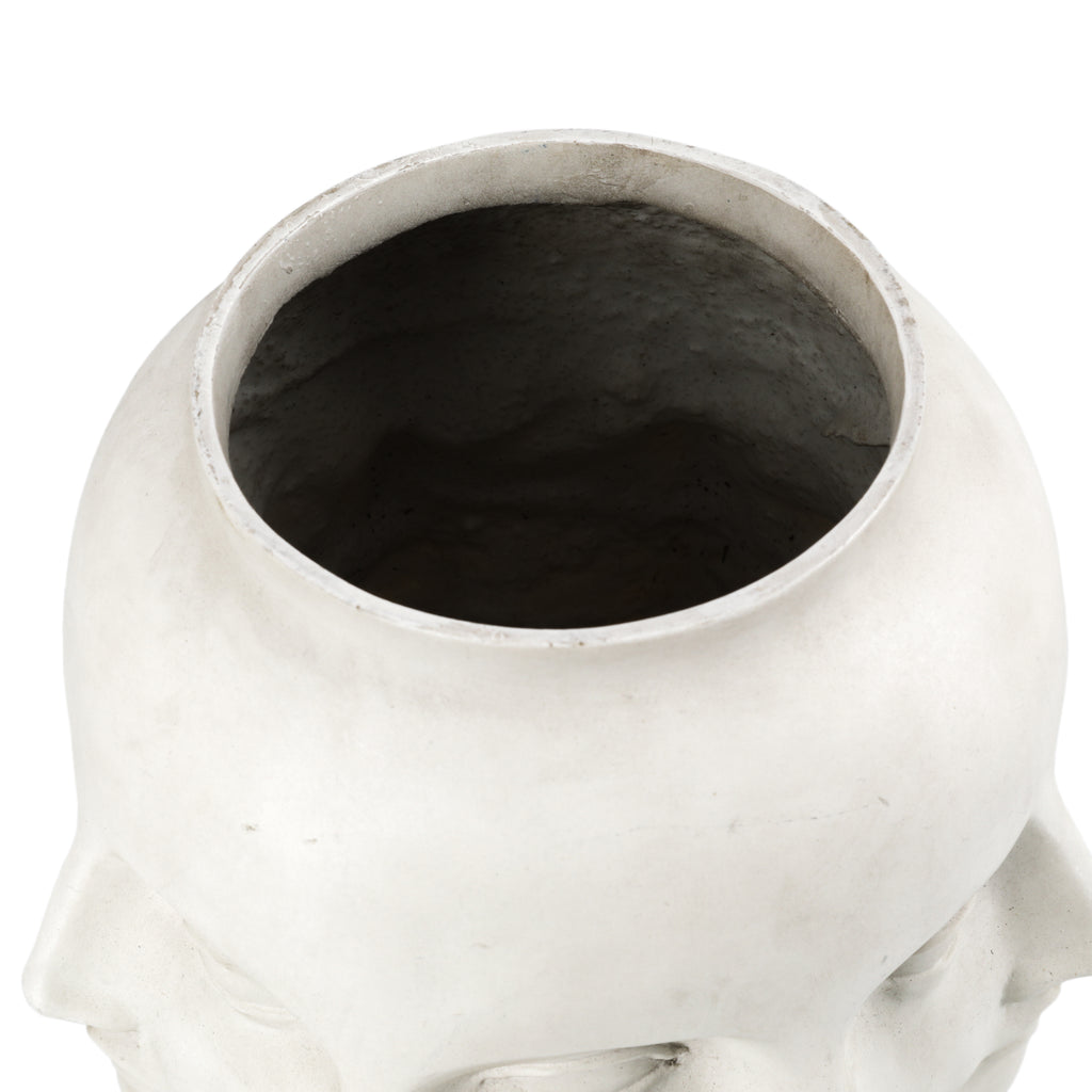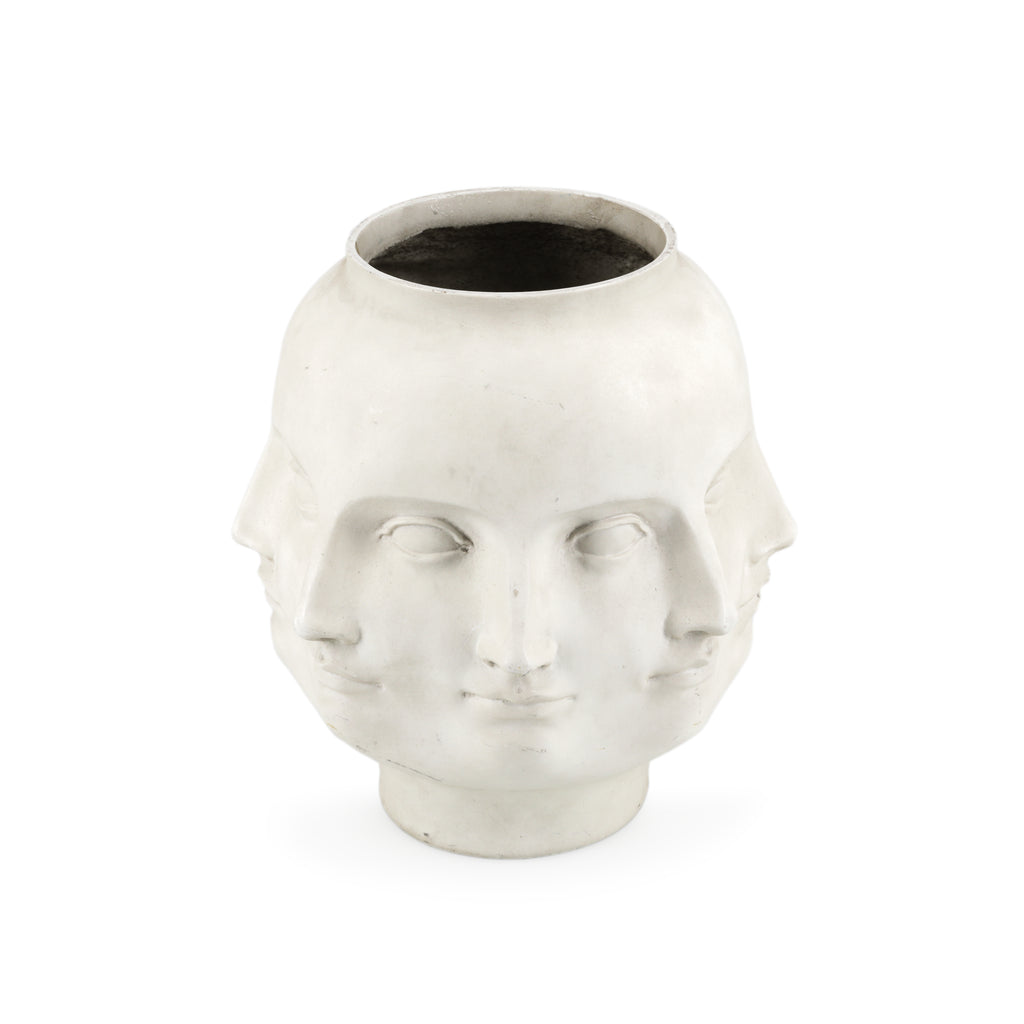 Details: White vase featuring multiple sculpted faces that blend into one another