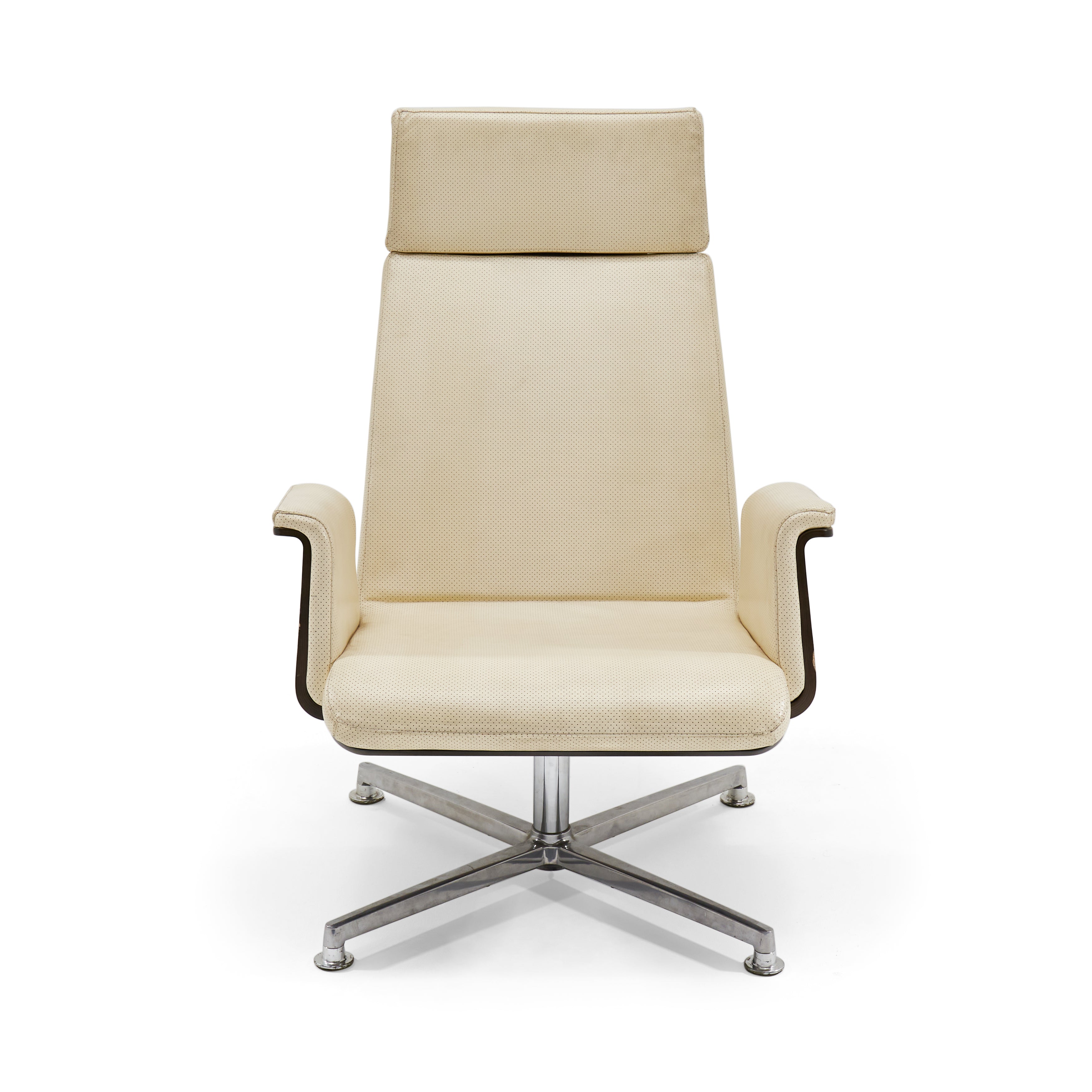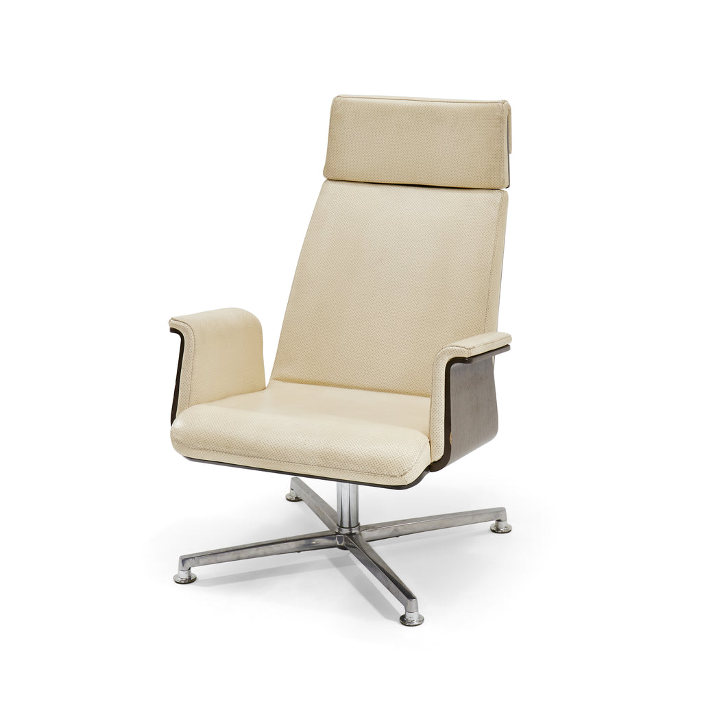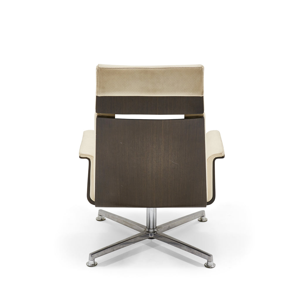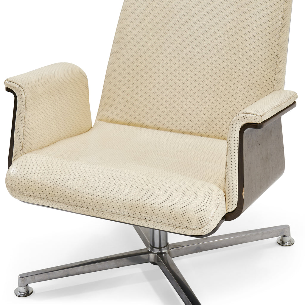 Details: Vintage off white leather upholstery, Wood Frame/ back, silver metal star base