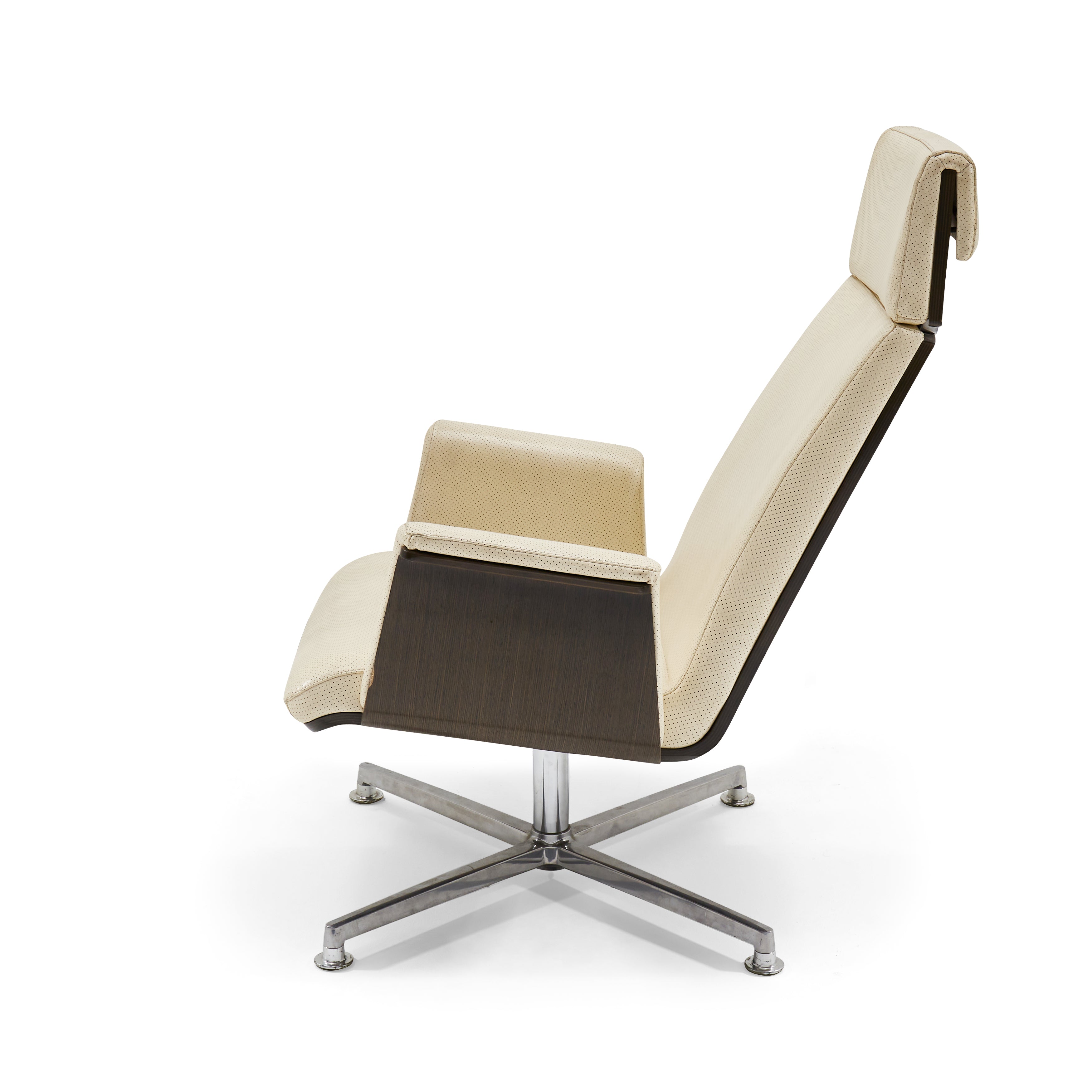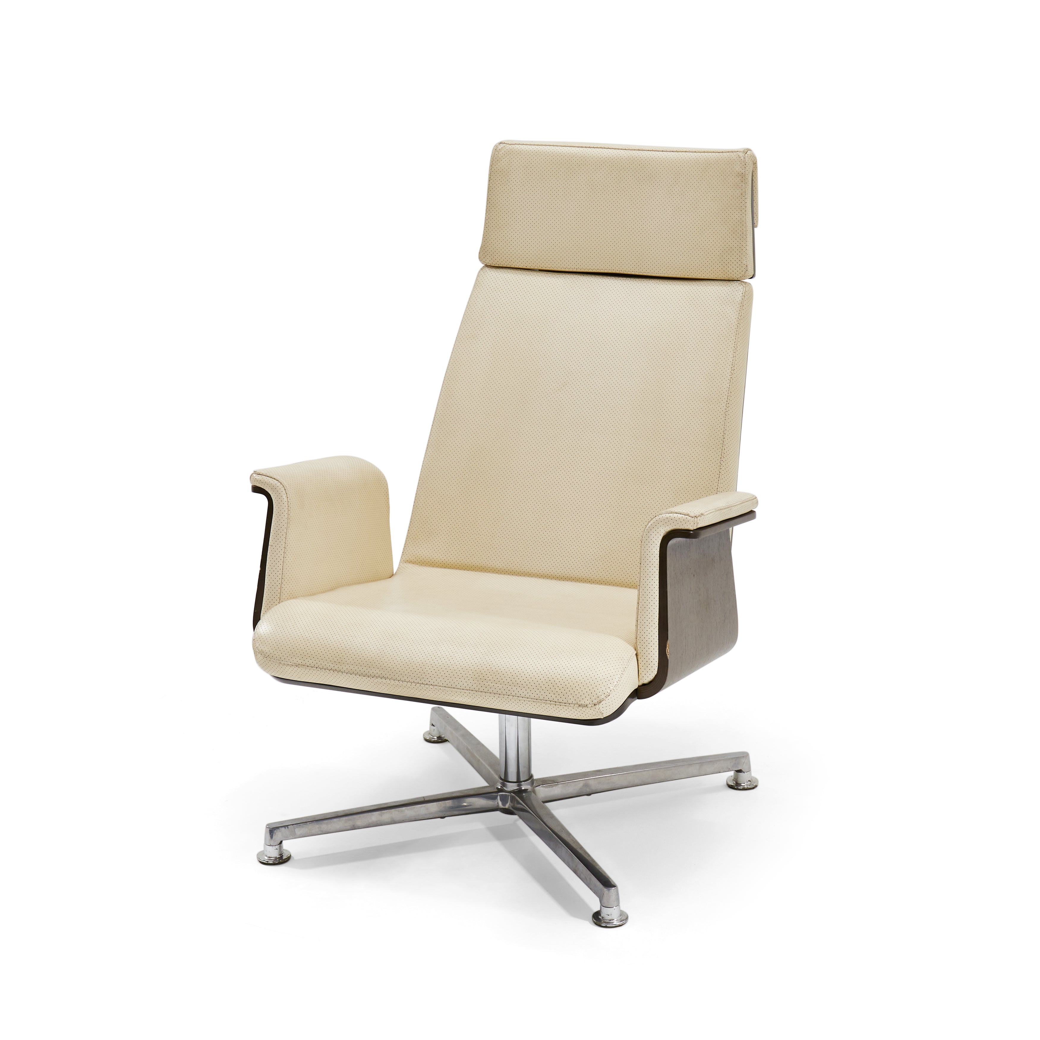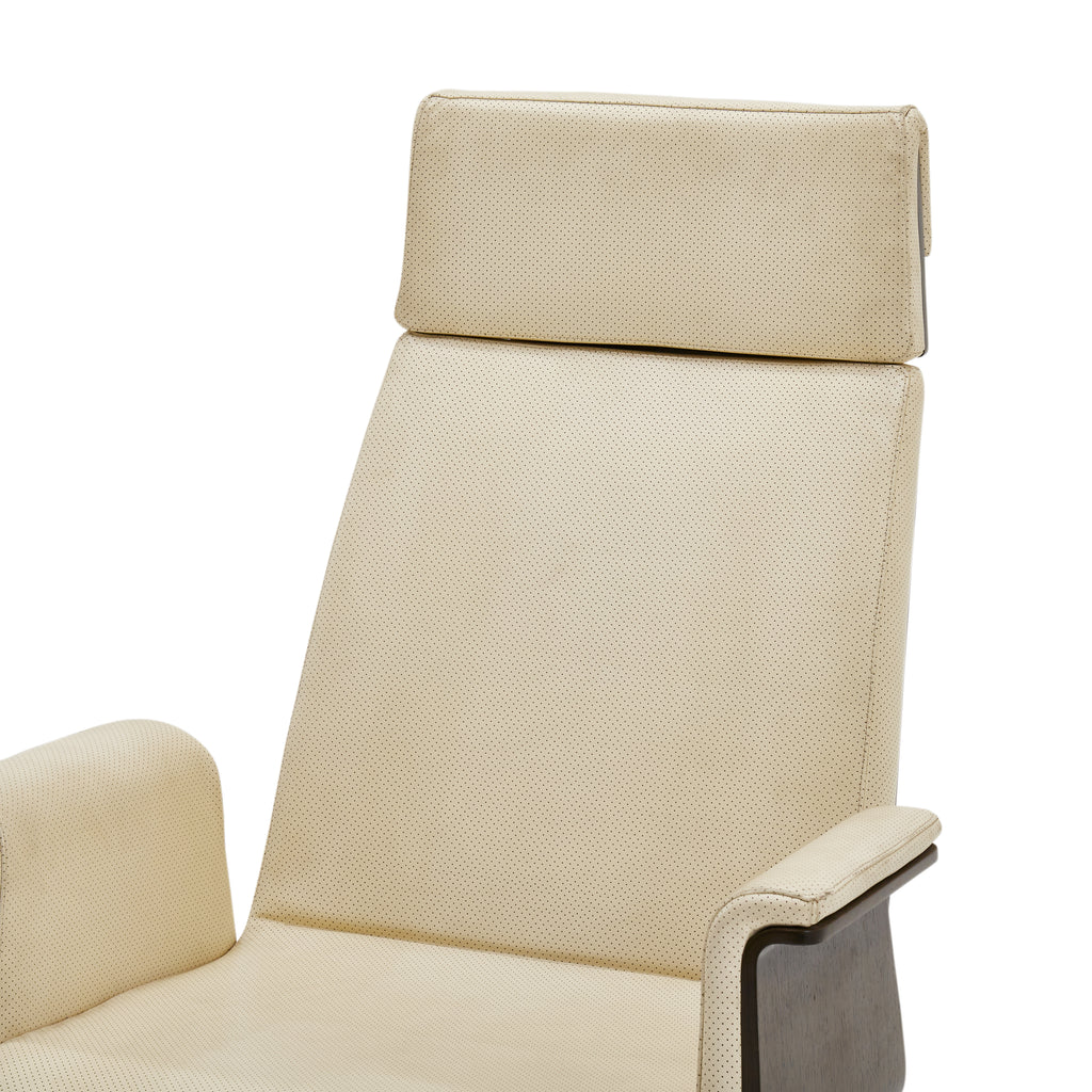 Details: Vintage off white leather upholstery, Wood Frame/ back, silver metal star base