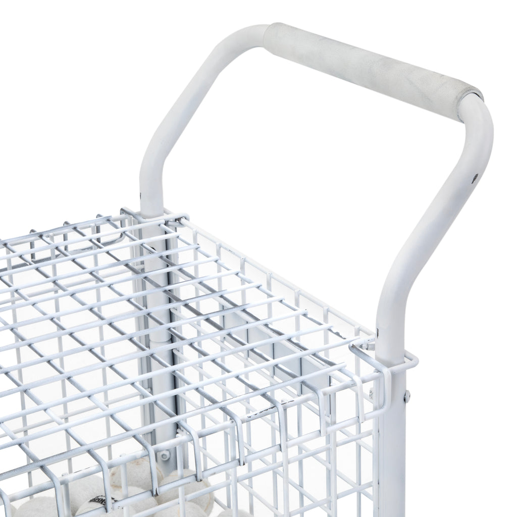 Details: White tennis ball carrier with rolling base.