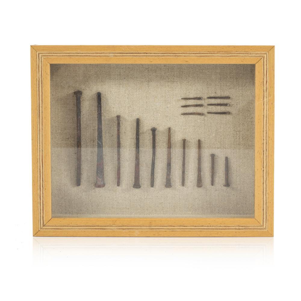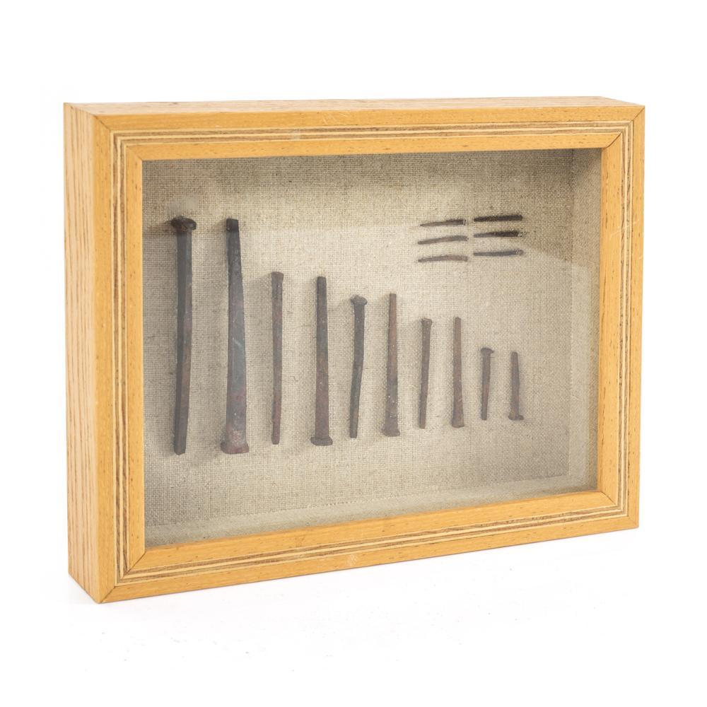 Details: Light wood shadow box with rustic industrial nails.