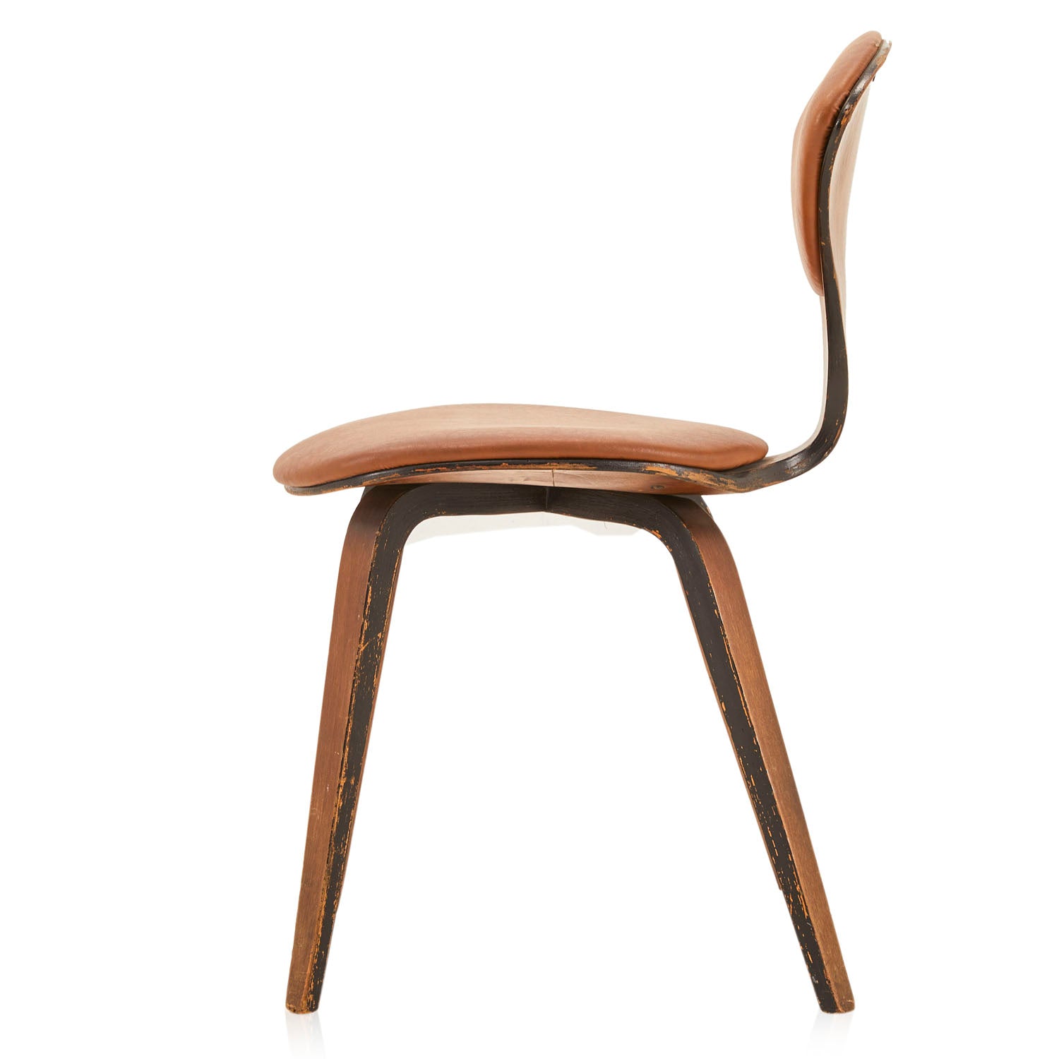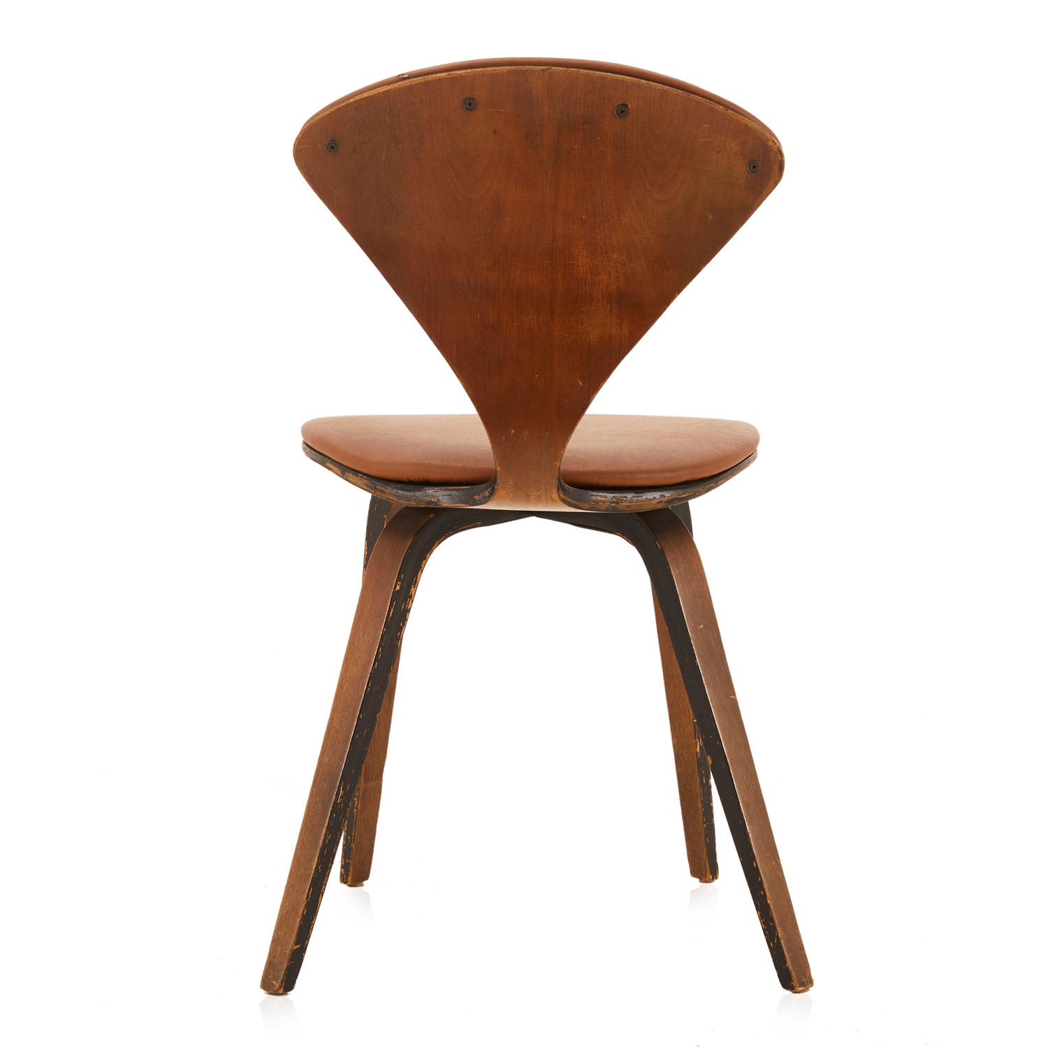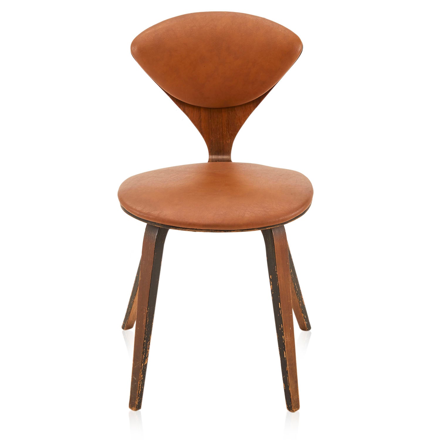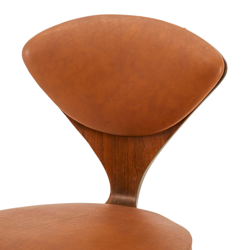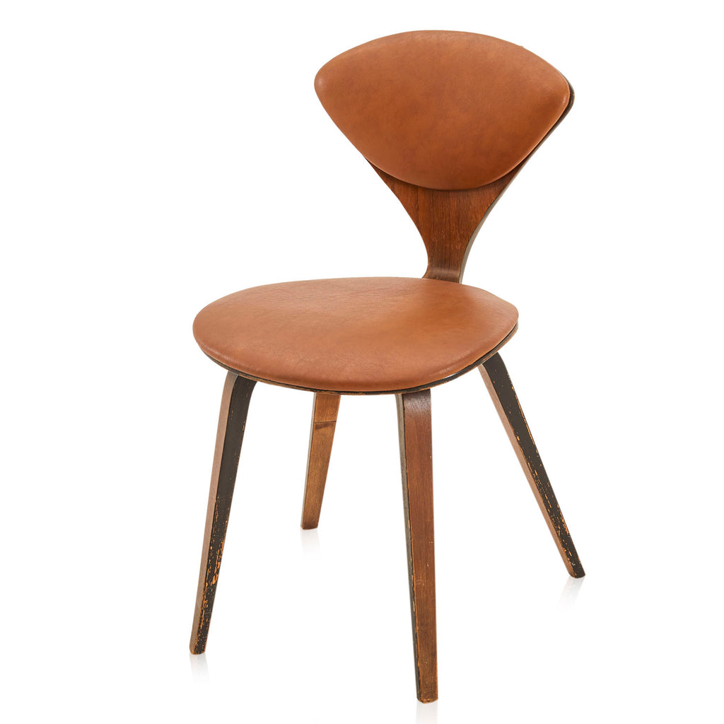 Details: Norman Cherner style side chair with caramel brown leather upholstered back + seat