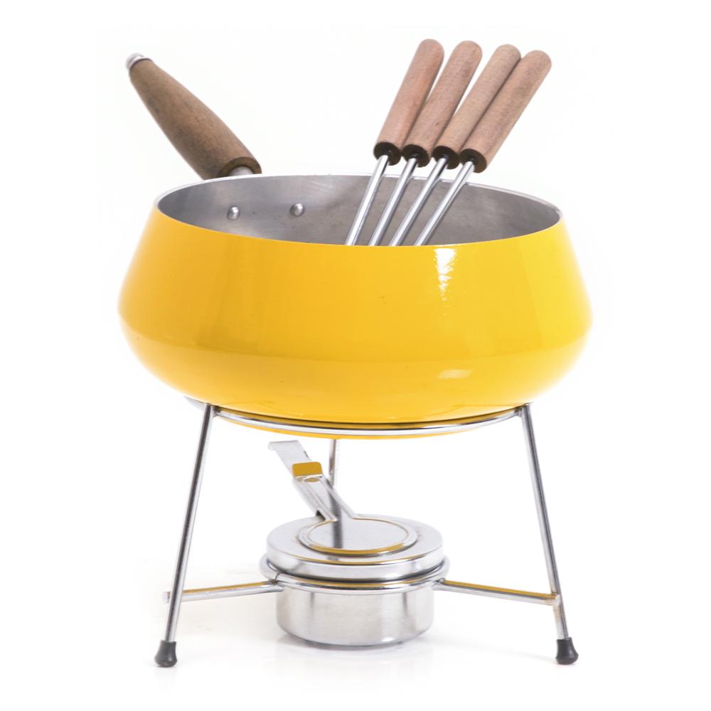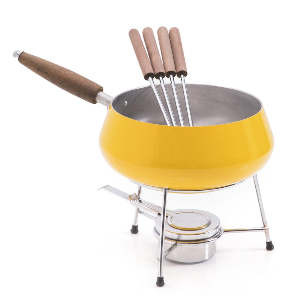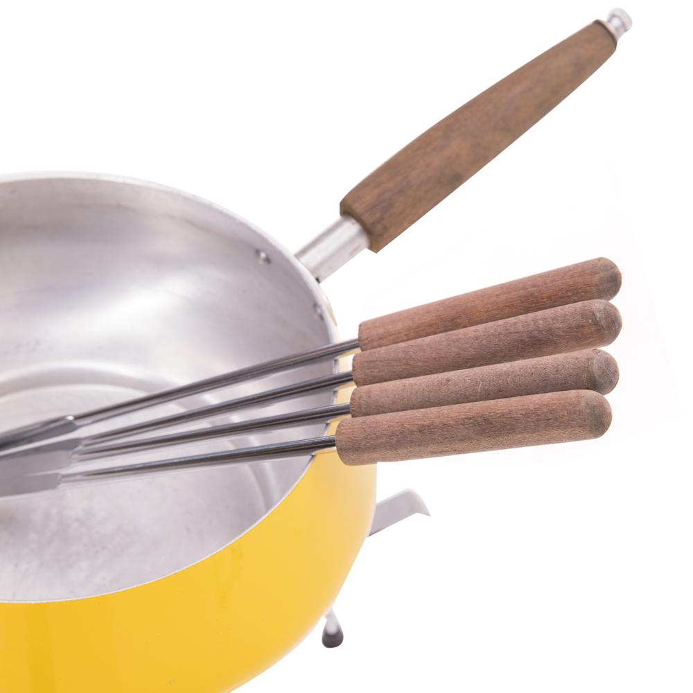 Details: Yellow Fondue Pan, Wood Handle, Small Burner, Fondue Forks with Wood Handles