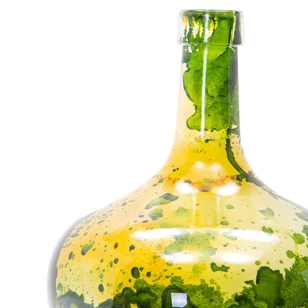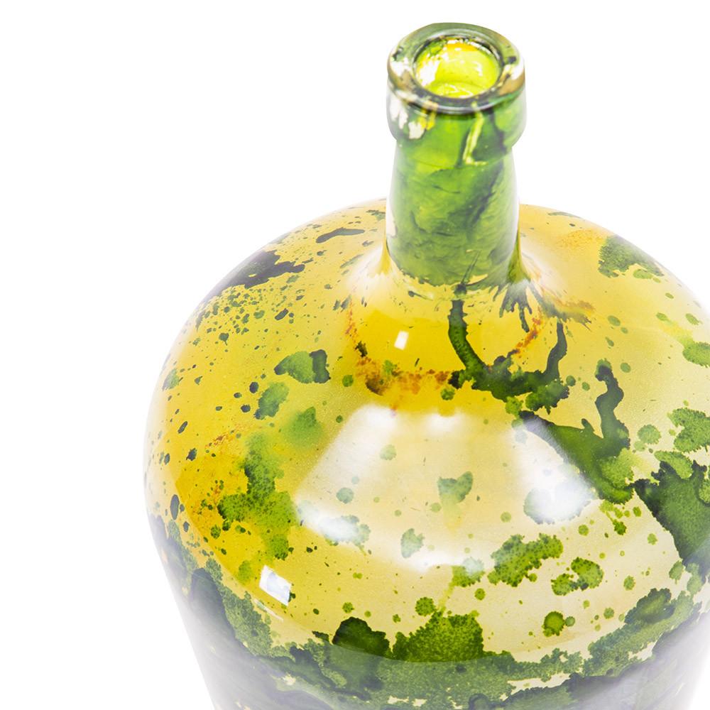 Details: Bottleneck glass vase with abstract yellow and green splatter design.